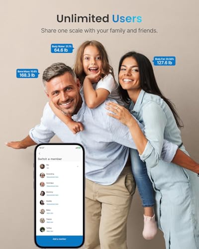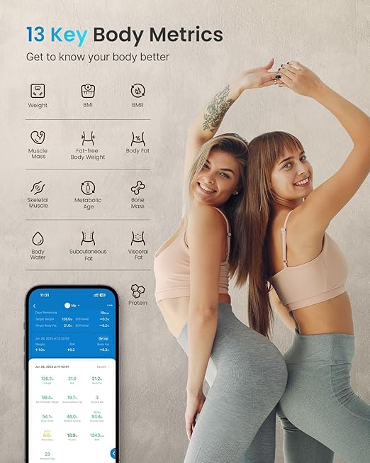 Tracks 13 essential body metrics including weight, body fat, and muscle mass